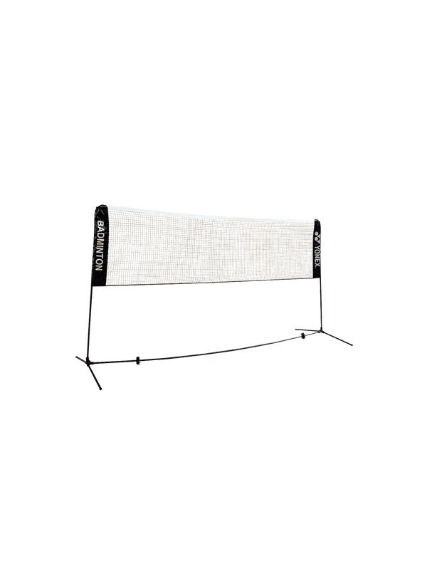 This is a lightweight portable net that can be used for school gym or your backyard. Easy to assemble and setup. Set comes with the poles and net. The set is 10 feet wide that is half the size of a regular badminton court.